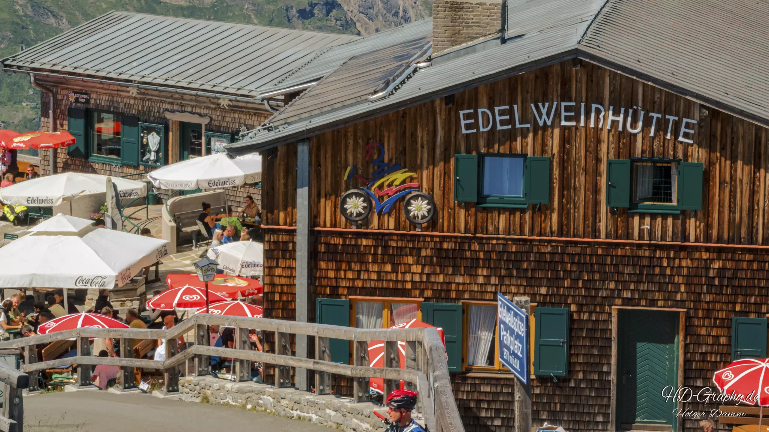 Die Edelweißhütte auf über 2.500 Metern Höhe ist ein idealer Ort für eine Rast. Von hier aus reicht der Blick bis weit über die Alpen hinaus, und wer den Moment festhalten will, findet zahlreiche Fotomotive – von Bergpanoramen bis zu den Blumen des Hochgebirges.